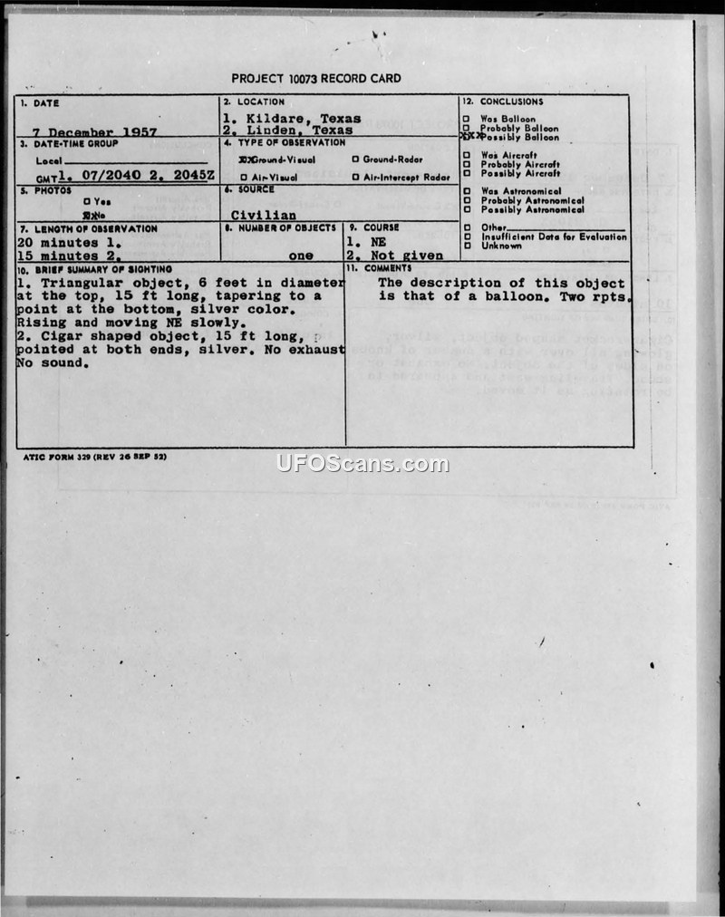 This Project 10073 record card documents a sighting incident that occurred on December 7, 1957, in the vicinity of Kildare and Linden, Texas. The report details two distinct observations of aerial objects. The first object is described as triangular, measuring six feet in diameter at the top and fifteen feet in length, tapering to a point at the bottom. It was observed to be silver in color, rising and moving slowly in a northeasterly direction for a duration of twenty minutes. The second object is described as cigar-shaped, fifteen feet long, and pointed at both ends. It was also silver in color, exhibited no exhaust, and made no sound during its fifteen-minute observation. The source of the reports is identified as civilian. The official conclusion recorded on the card states that the description of the objects is consistent with that of a balloon, noting that two reports were received regarding the incident.