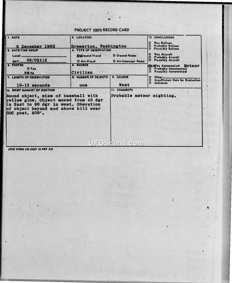 A civilian in Bremerton, Washington, reported a glowing round object in 1963. While initially recorded as a meteor, ATIC investigators concluded it was likely a balloon reflecting sunlight.