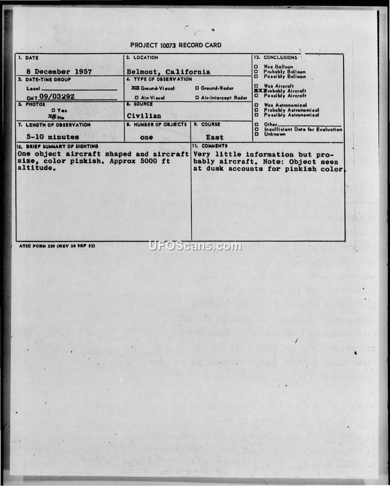 Project 10073 Record Card — Belmont, California, 8 December 1957