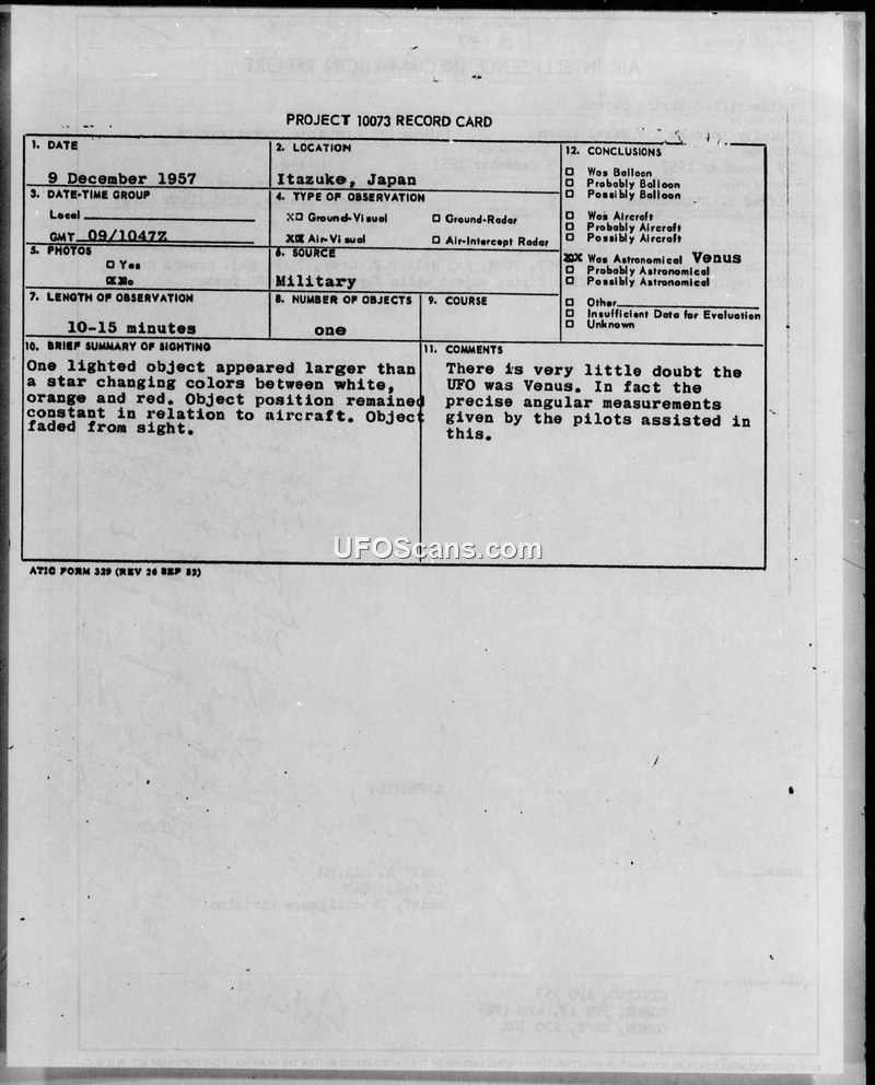 PROJECT 10073 RECORD CARD — Itazuke, Japan, 9 December 1957