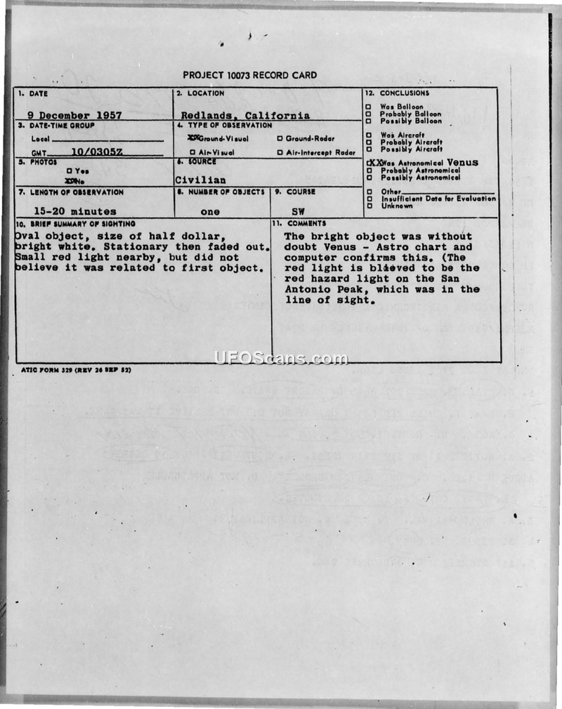 Project 10073 Record Card — Redlands, California, 9 December 1957