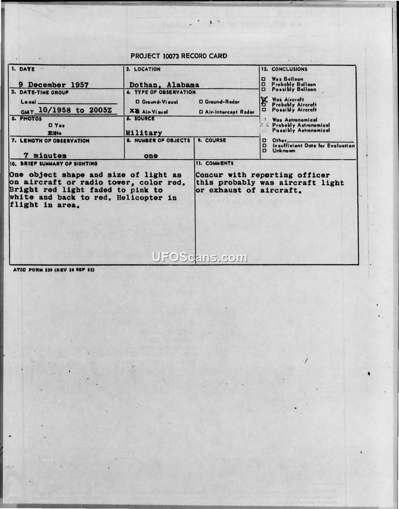 Report on Unidentified Flying Object — Dothan, Alabama, 9 December 1957