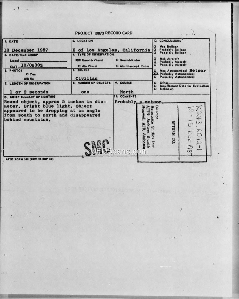 Project 10073 Record Card — 10 December 1957 Sighting, Los Angeles, California