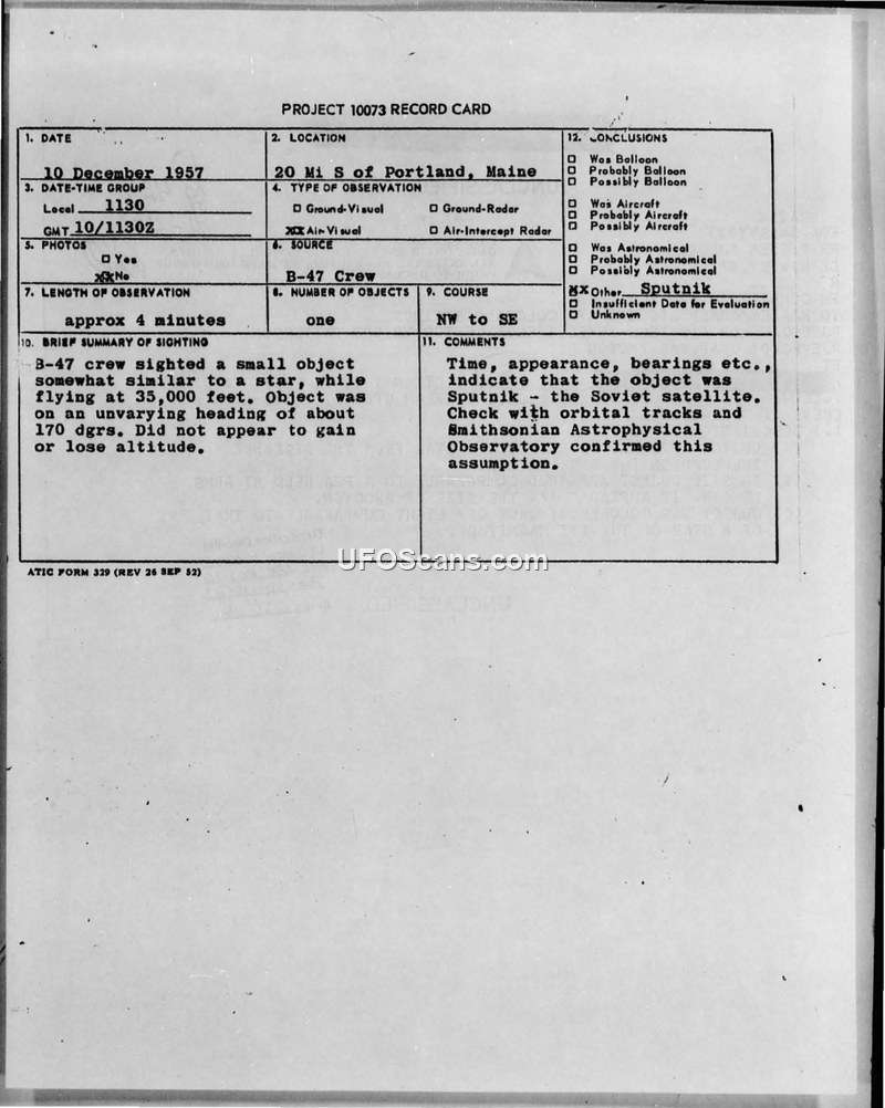 B-47 air crews reported a sighting of an unidentified object on December 10, 1957, near Portland, Maine. The object was subsequently identified as the Soviet satellite Sputnik by the Smithsonian Astrophysical Observatory.
