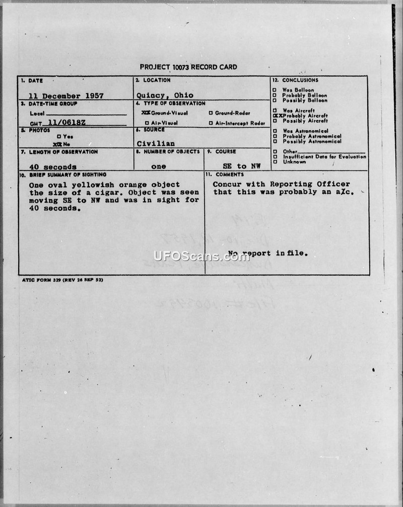 PROJECT 10073 RECORD CARD - 11 December 1957 - Quiacy, Ohio