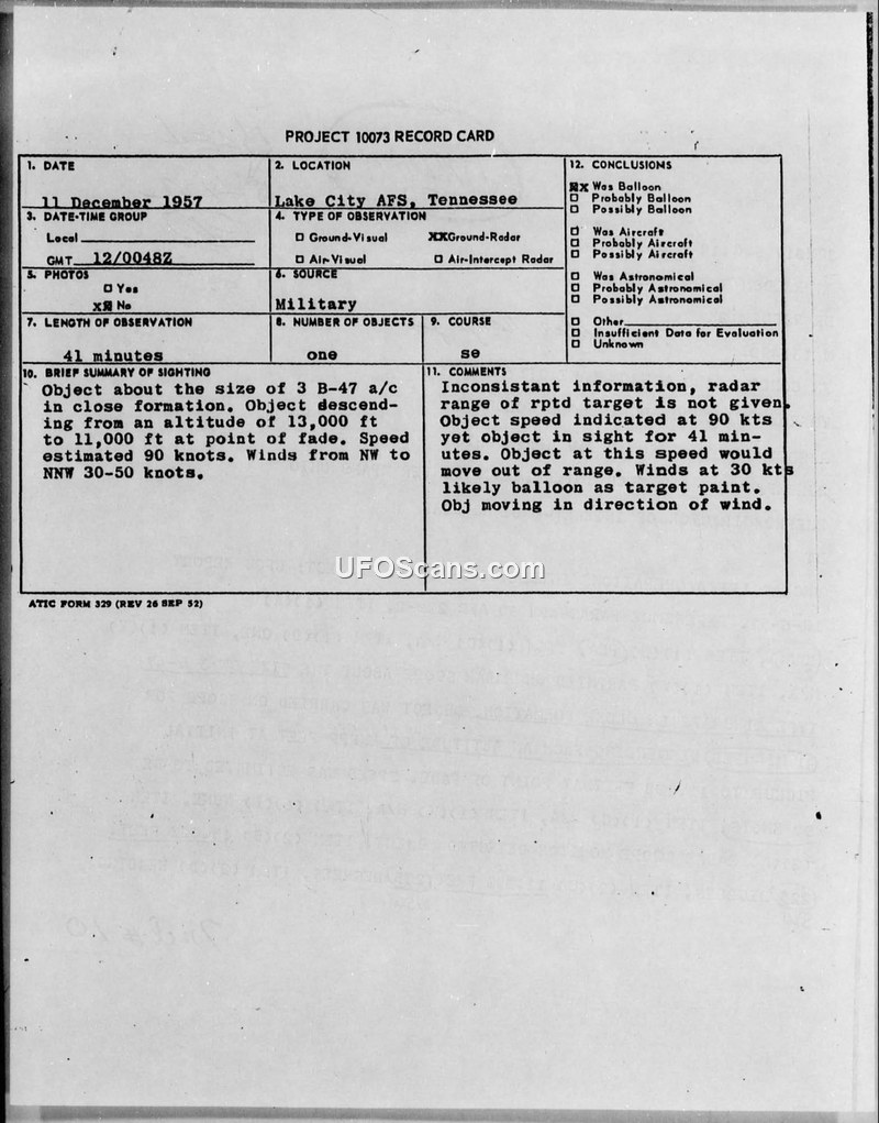 Project 10073 Record Card and UFOB Report IR-6-57 — Lake City AFS, Tennessee, 12 December 1957