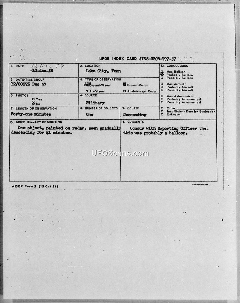 UFOB Index Card AISS-UFOB-797-57 and Associated Teletype