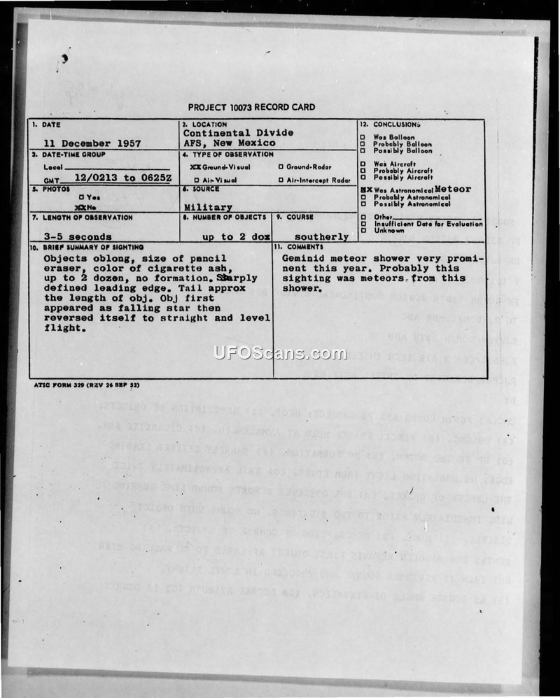 Military personnel at Continental Divide AFS reported multiple unidentified objects on December 11, 1957. While officially attributed to the Geminid meteor shower, the observers rejected this explanation due to the objects' level flight characteristics.