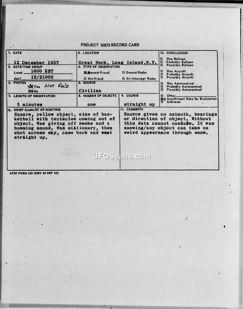 A reporter in Great Neck, NY, reported a square, yellow, tentacled object on December 12, 1957. ATIC investigators dismissed the report due to lack of directional data and poor weather conditions.