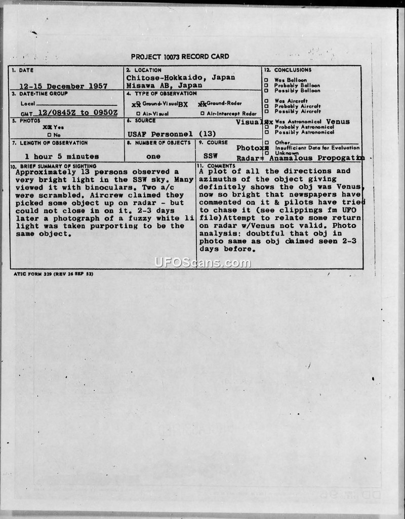Project 10073 Record Card: Sighting at Chitose-Hokkaido, Japan, 12-15 December 1957