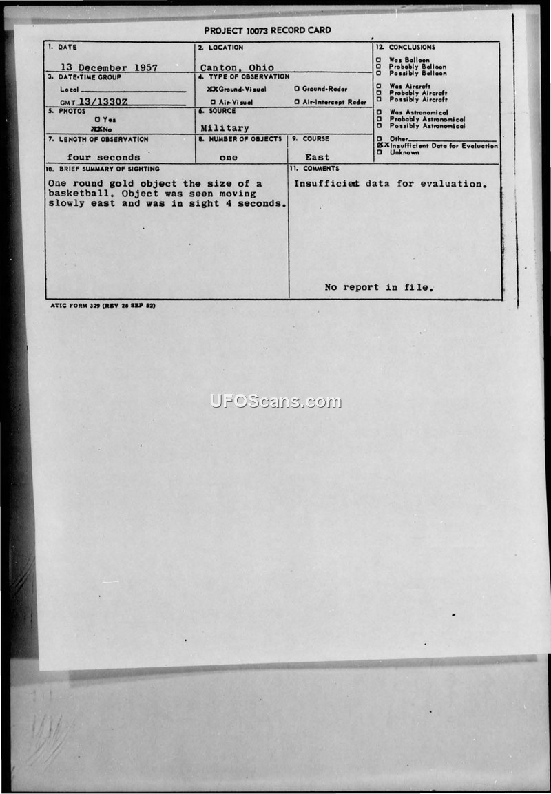 PROJECT 10073 RECORD CARD — Canton, Ohio, 13 December 1957