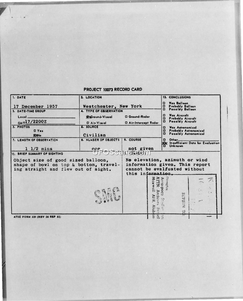Project 10073 Record Card — Westchester, New York, 17 December 1957