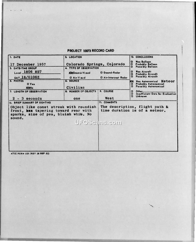 A sighting of a bluish-white, comet-like object in Colorado Springs on December 17, 1957, was officially identified by military intelligence as a meteor. The report includes corroborating observations from military personnel and civilians.