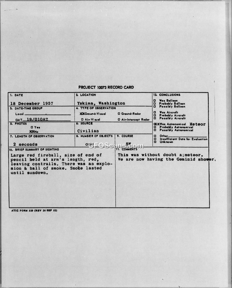 A December 1957 sighting of a red fireball in Yakima, Washington, was officially identified by the Air Technical Intelligence Center as a meteor associated with the Geminid shower. The report includes corroborating accounts from other locations in the Pacific Northwest.