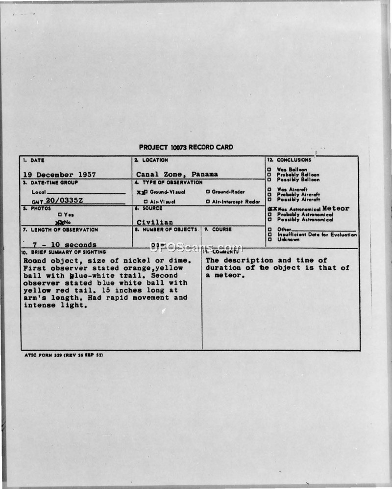 A sighting of a luminous object in the Canal Zone on 19 December 1957 was reported by two witnesses. The Air Technical Intelligence Center concluded the object was a meteor.