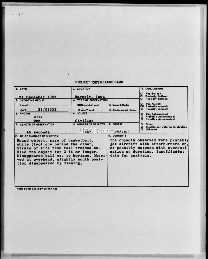 A civilian in Waverly, Iowa, reported two glowing, basketball-sized objects trailing fire on December 21, 1957. Military investigators concluded the sighting was likely jet aircraft with afterburners or meteors.