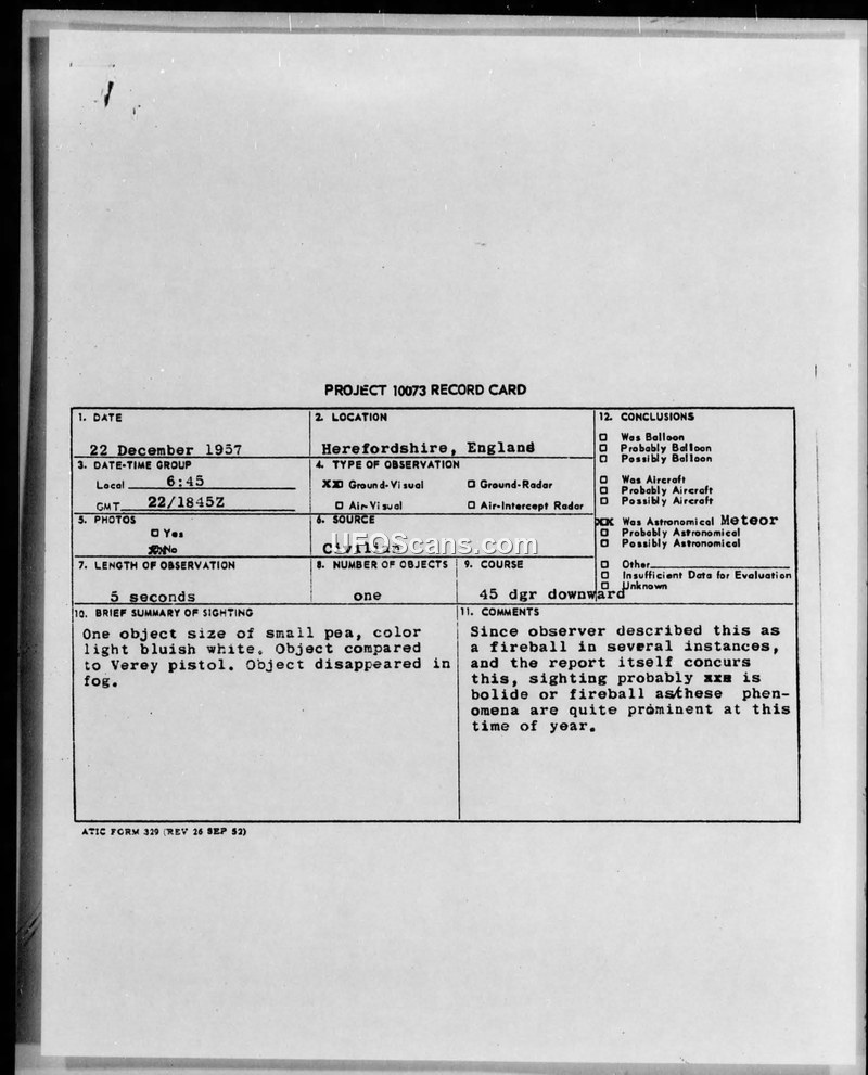 Project 10073 Record Card — Herefordshire, England, 22 December 1957