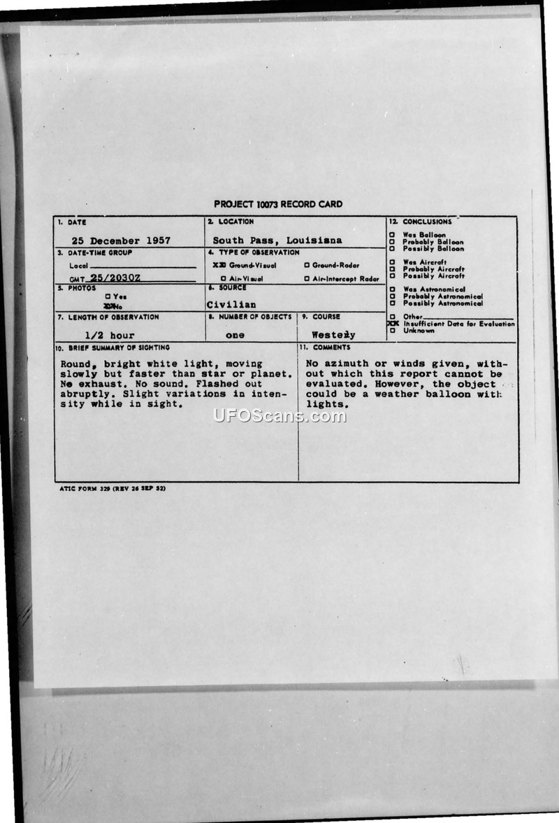 A USCG witness reported a bright, slow-moving light over South Pass, Louisiana, on Christmas 1957. The investigation concluded there was insufficient data to identify the object, though it may have been a weather balloon.
