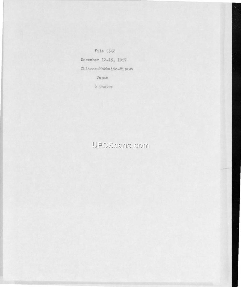 This document, identified as File 5542, serves as a brief record of a series of sightings occurring between December 12 and December 15, 1957, in the vicinity of Chitose, Hokkaido, and Misawa, Japan. The document contains minimal descriptive text, primarily functioning as a cover sheet for a collection of photographic evidence. It explicitly notes the inclusion of six photographs, three of which are provided in the subsequent pages of the file. These photographs depict a singular, luminous, circular object against a dark background. The document provides no narrative details regarding the nature of the sightings, the witnesses involved, or any official analysis or conclusions reached by military or intelligence authorities. The handwritten notation 'See over' appears on the third page, though no further descriptive information is present in the provided scan. The file remains a sparse archival record of a UAP-related event in Japan during the late 1950s.