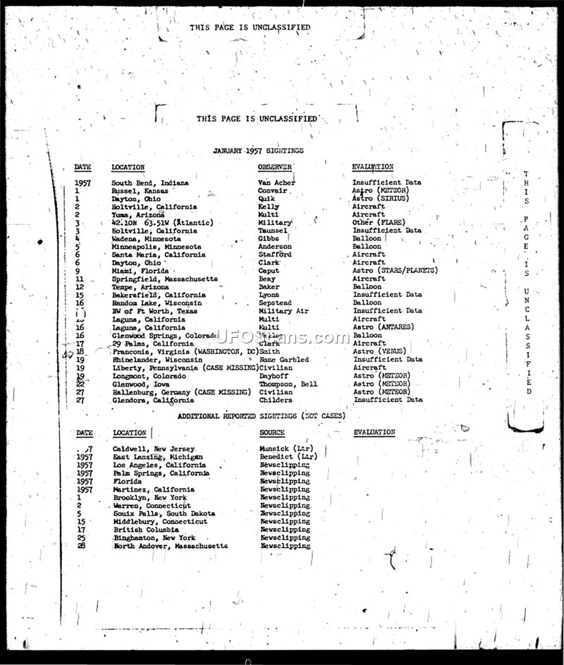 This document is a monthly log of UAP sightings reported between January and November 1957. It categorizes each incident by date, location, observer, and evaluation, serving as a reference for the volume and nature of reports during that year.