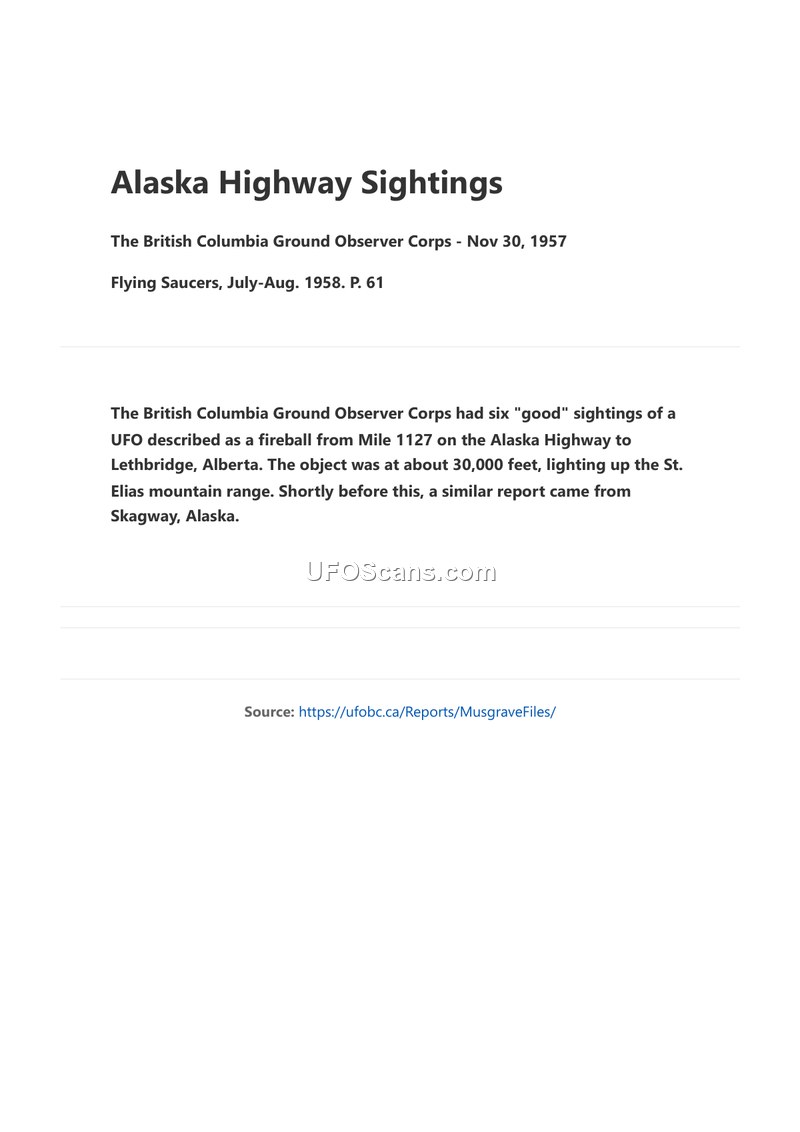 The British Columbia Ground Observer Corps reported six fireball-like UFO sightings on November 30, 1957, across the Alaska Highway and Alberta. The object was observed at 30,000 feet and illuminated the St. Elias mountain range.