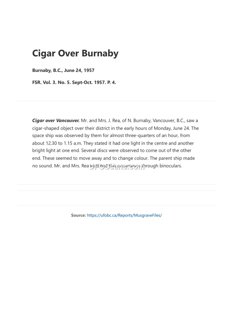 A report from 1957 detailing a sighting by Mr. and Mrs. J. Rea of a cigar-shaped object in Burnaby, B.C. The object was observed for 45 minutes and appeared to release smaller disc-shaped objects.