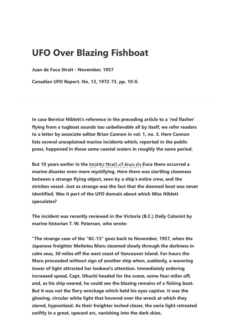 This article from the Canadian UFO Report (No. 13, 1972-73) recounts a mysterious maritime incident from November 1957. The Japanese freighter Meitetsu Maru, while navigating 30 miles off the west coast of Vancouver Island, discovered a burning fishing vessel. The ship's captain, Capt. Ohuchi, observed a glowing, circular white light hovering over the wreckage. As the freighter approached, the light retreated in an upward arc and vanished. Despite an extensive search by the United States Coast Guard and the RCAF covering over 6,000 square miles, no survivors were found. The only wreckage recovered was a gasoline tank identified as belonging to the Nanaimo fishing craft Jo-Joe, which had gone missing on October 30, 1957. The burning vessel bore the markings 'KC-13-ac', which could not be identified as a legitimate registration number for any Canadian or American fishing boat. The article notes that as of 1972, the cause of the fire and the nature of the light remain unexplained.