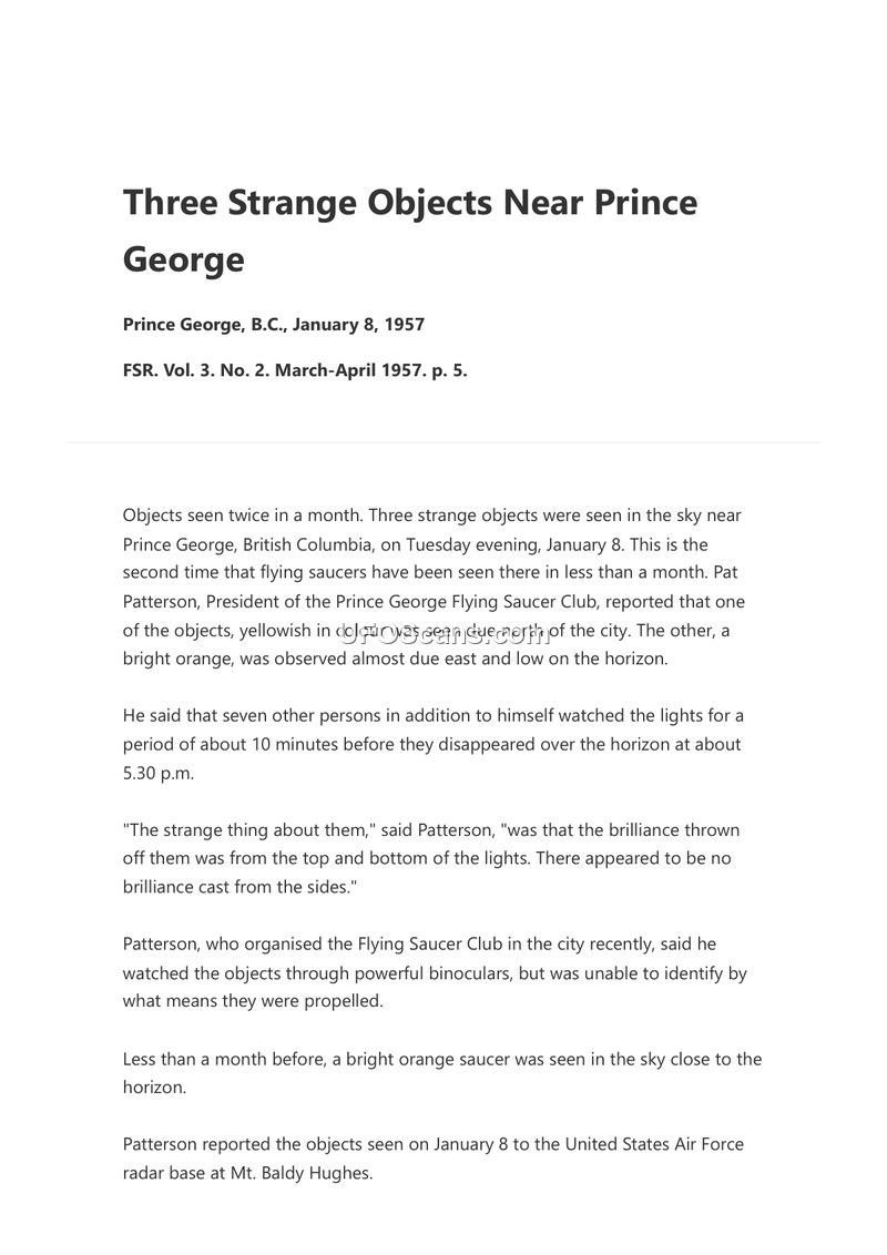 This document reports a January 1957 sighting of three unidentified objects near Prince George, British Columbia, by Pat Patterson and seven others. The objects were observed for ten minutes and reported to the United States Air Force radar base at Mt. Baldy Hughes.