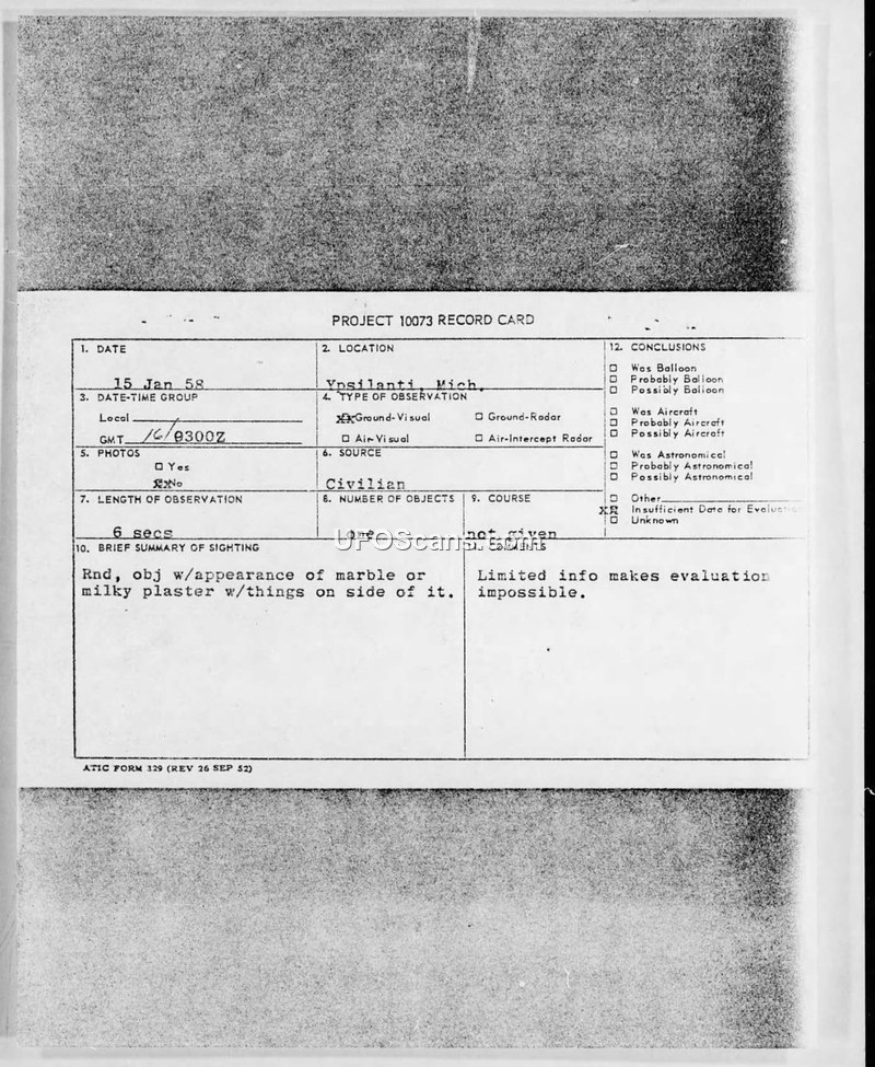 A 1958 civilian sighting report from Ypsilanti, Michigan, describing a round, marble-like object. The military investigation concluded that the report contained insufficient data for a formal evaluation.