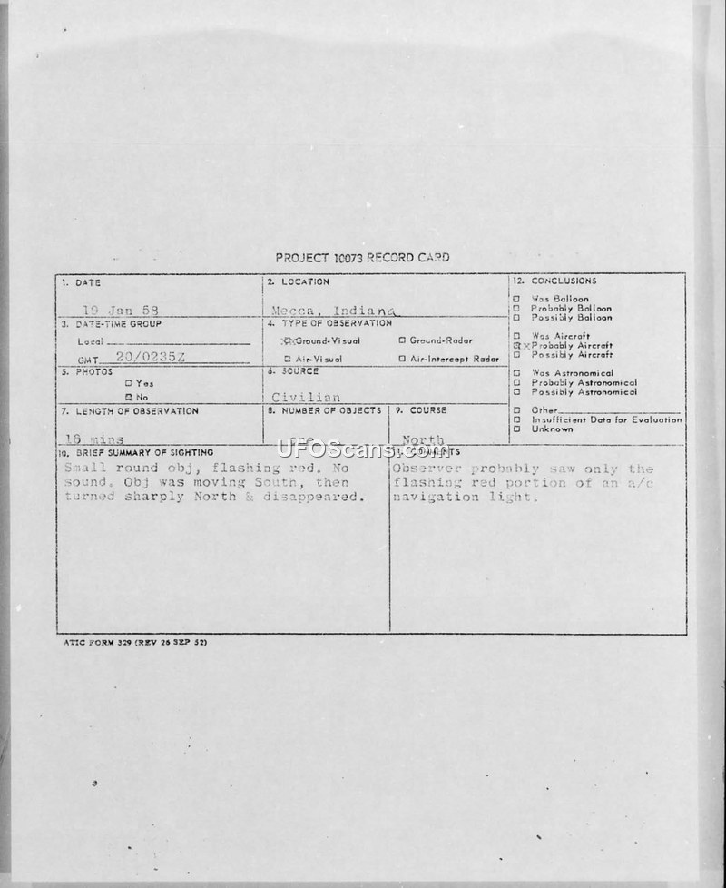 Project 10073 Record Card — Mecca, Indiana, 19 January 1958