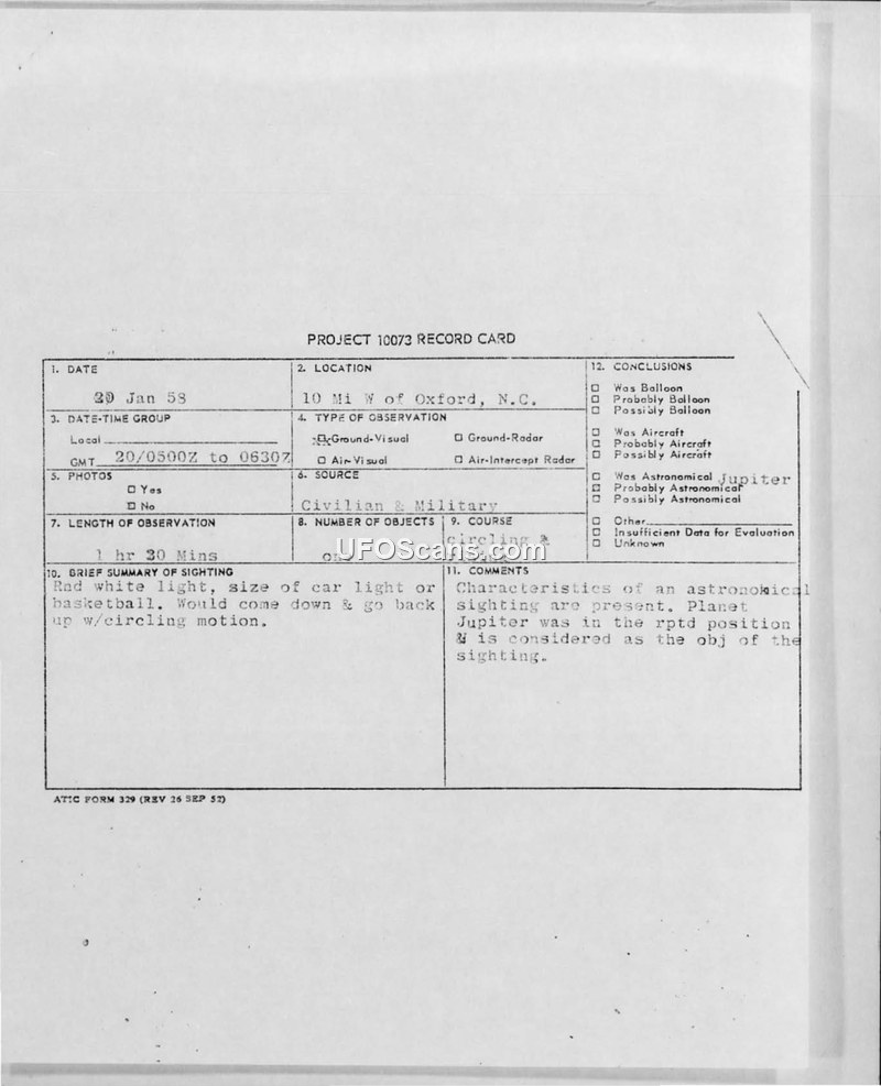 Project 10073 Record Card — 20 January 1953, Oxford, N.C.