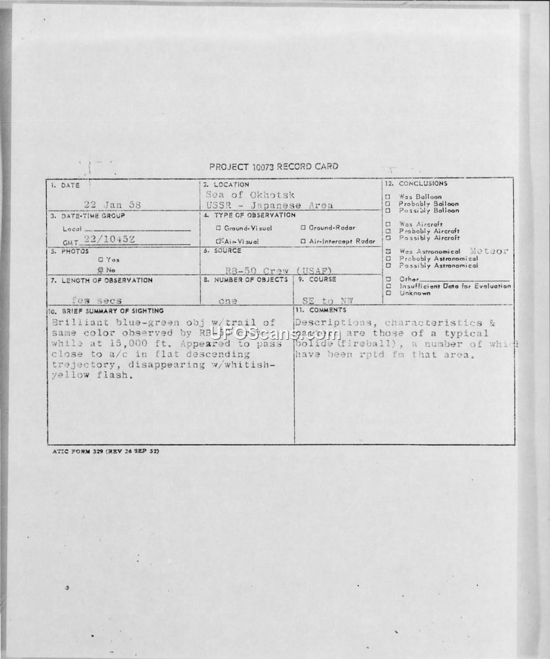 This document collection details a UFO sighting reported by an RB-50 crew on 22 January 1958, near the Sea of Okhotsk at coordinates 57 10N 140 35E. The crew observed a brilliant blue-green object with a matching trail, which appeared to descend near the aircraft in a flat trajectory before disappearing with a whitish-yellow flash. The sighting lasted only a few seconds under clear weather conditions with excellent visibility. Notably, the report mentions that voice communications were intercepted and recorded, and that these communications stopped abruptly during the event. The incident was documented on a Project 10073 record card and subsequently processed through military channels, including the 67th Tactical Reconnaissance Wing and CINCPACAF. Internal Air Force correspondence between AFCIN-4E4 and AFCIN-4F3 in February 1958 reveals that the military was actively investigating these sightings as potential indicators of foreign missile activity. Analysts noted that the characteristics of the object were consistent with a bolide or fireball, a phenomenon frequently reported in the area during the preceding year. However, the possibility of missile activity was not ruled out, as similar objects had been reported by both Air Force and Navy personnel within the same region over a two-month period. A plot of the objects' trajectories suggested a potential point of origin near the northernmost point of the Sakhalin islands. Despite the investigation, AFCIN-4F3 concluded by 21 February 1958 that there was no known surface-to-air, surface-to-surface, or air-to-air missile activity in the area on the dates in question, and offered no further explanation for the incidents.