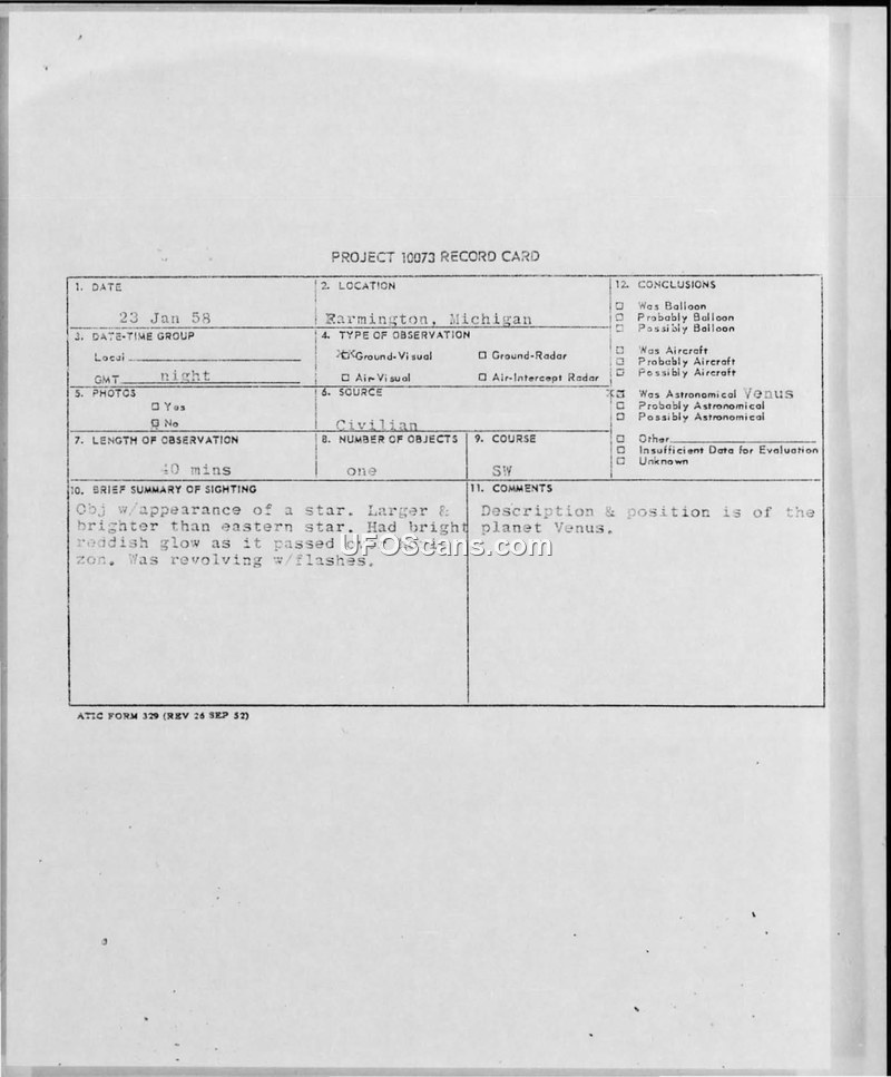 A civilian in Farmington, Michigan, reported a bright, flashing object on January 23, 1958. Military intelligence evaluated the report and concluded the object was the planet Venus.
