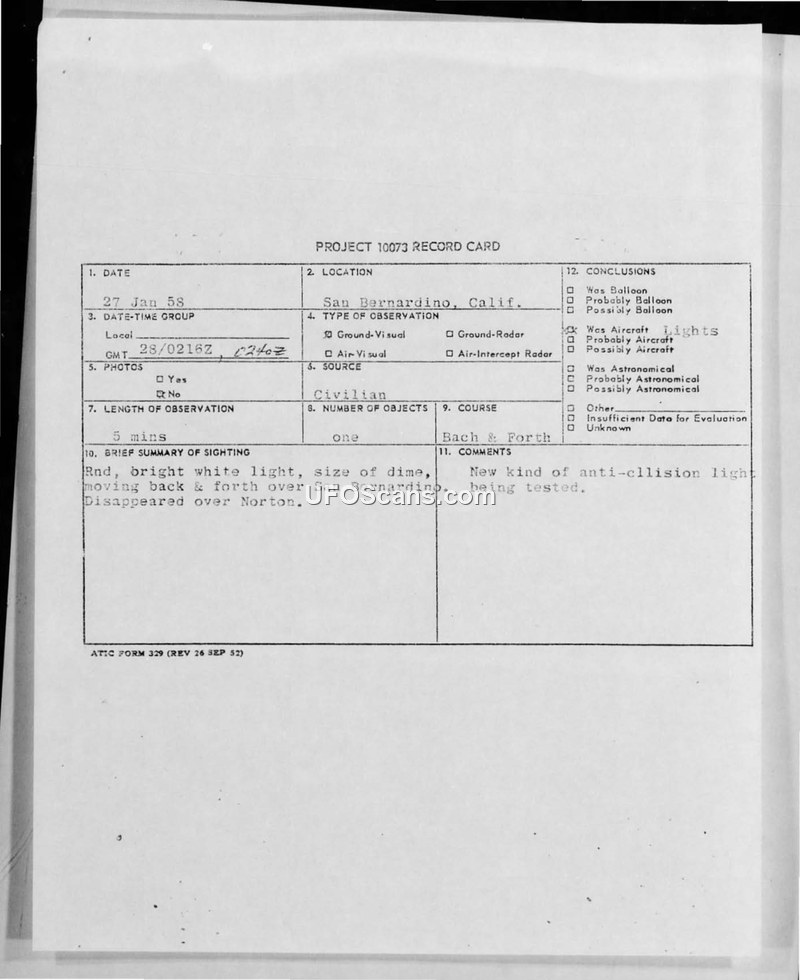 This document consists of a series of military teletype reports and a Project 10073 record card documenting a sequence of UFO sightings reported in San Bernardino, California, on January 27, 1958. Multiple civilian witnesses reported observing a bright, white, round object that moved in a zig-zag pattern, circled, and hovered over the area for approximately five minutes. One witness reported that the object appeared to be the size of a dime. The reports were forwarded to the Air Technical Intelligence Center (ATIC) and the Director of Intelligence at HQ USAF for evaluation. Following an investigation by the 27th Air Division, Captain Smith, a controller for the division, clarified that the sightings were not of an unidentified aerial phenomenon, but rather a T-33 aircraft conducting a test flight. The aircraft, which was operating out of Norton Air Force Base, was testing a new type of anti-collision light designed to make jet aircraft easier to spot. The report notes that the T-33 was accompanied by two other 'T-Birds' and a C-45 during the exercise. The final conclusion reached by the military authorities was that the reported 'UFO' was simply this specialized lighting equipment being evaluated in the night sky over San Bernardino.
