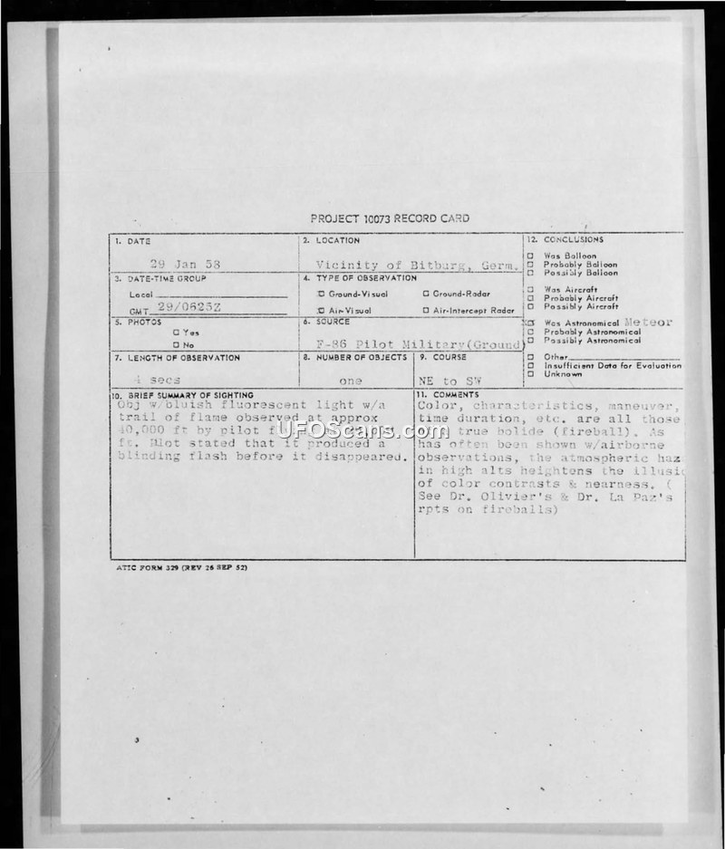PROJECT 10073 RECORD CARD: Sighting near Bitburg, Germany, 29 January 1958