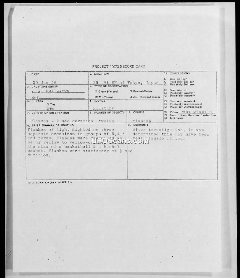 On January 30, 1958, Major Herbert M. Carr and Major Clayton F. Gray, flying a T-33 aircraft at 30,000 feet, observed a series of unusual lights while on a routine training flight near Zama, Japan. The pilots reported sighting a total of 12 lights on three separate occasions, appearing in groups of 5, 4, and 3. The lights were described as yellow to yellow-orange in color, with a size estimated to be between a basketball and a bushel basket. The objects appeared to be stationary, with each flash lasting approximately one-half second. The pilots were flying at an altitude of 30,000 feet with unlimited visibility above a thin cloud layer at 10,000 feet. Following the incident, an intelligence investigation was conducted by the 41st Air Division. The investigation concluded that the lights were likely related to a missile test facility being established by the Japanese Defense Agency on the southern end of Nii Jima, located approximately 60 nautical miles south of Zama. A separate internal memo notes that Japan had recently fired rockets with plastic bodies from balloons, and it was believed these were the first such firings, potentially involving an anchored balloon. The report was initially classified but later declassified under authority AFR 205-11.