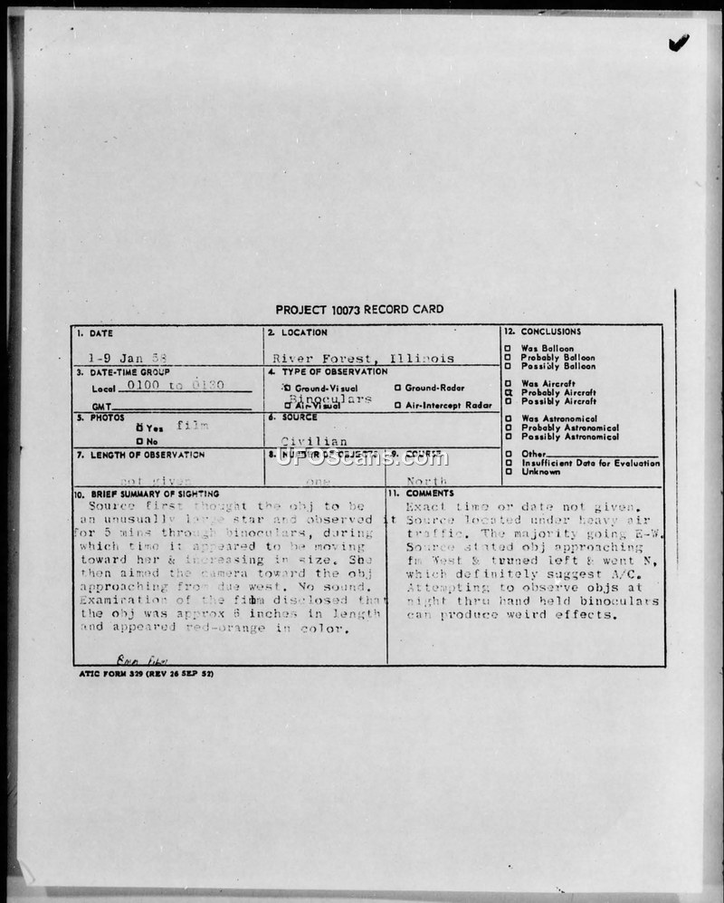 Project 10073 Record Card and OSI Report — River Forest, Illinois, January 1958