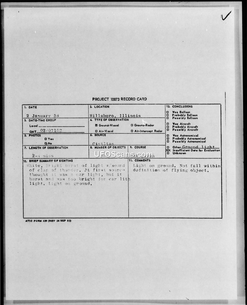 A civilian in Hillsboro, Illinois, reported a bright white light and a thunder-like sound on January 2, 1958. The military investigation concluded there was insufficient data and that the phenomenon did not meet the definition of a flying object.
