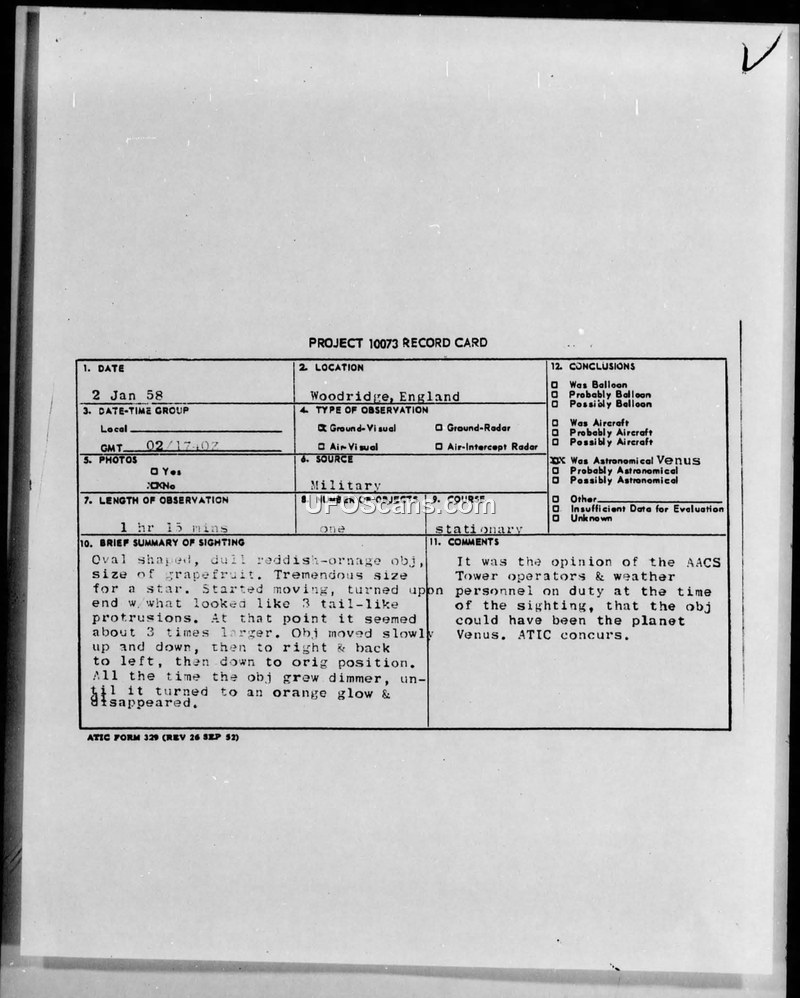 PROJECT 10073 RECORD CARD - Woodridge, England - 2 Jan 58