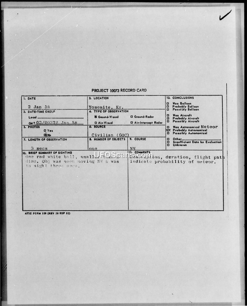 A Ground Observer Corps supervisor reported a 3-second sighting of a white, round object in Yosemite, Kentucky, on January 2, 1958. The military investigation concluded the object was likely an astronomical meteor.
