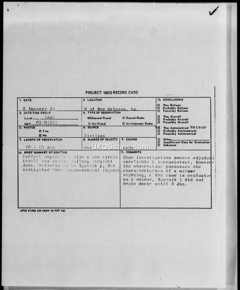 A civilian report of a Sputnik I sighting in Louisiana was investigated by the Air Force at the request of Senator Lyndon B. Johnson. The investigation concluded the object was a meteor and the source was unreliable.