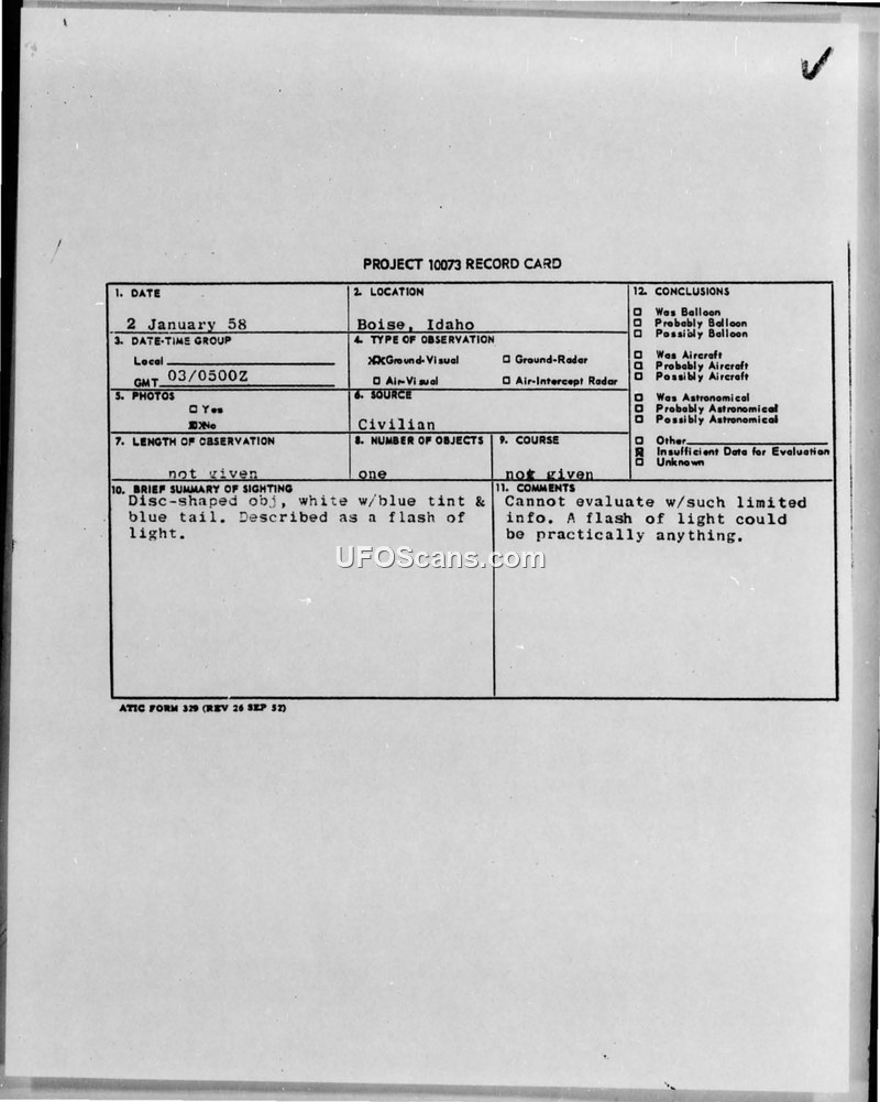 Project 10073 Record Card — Boise, Idaho, 2 January 1958