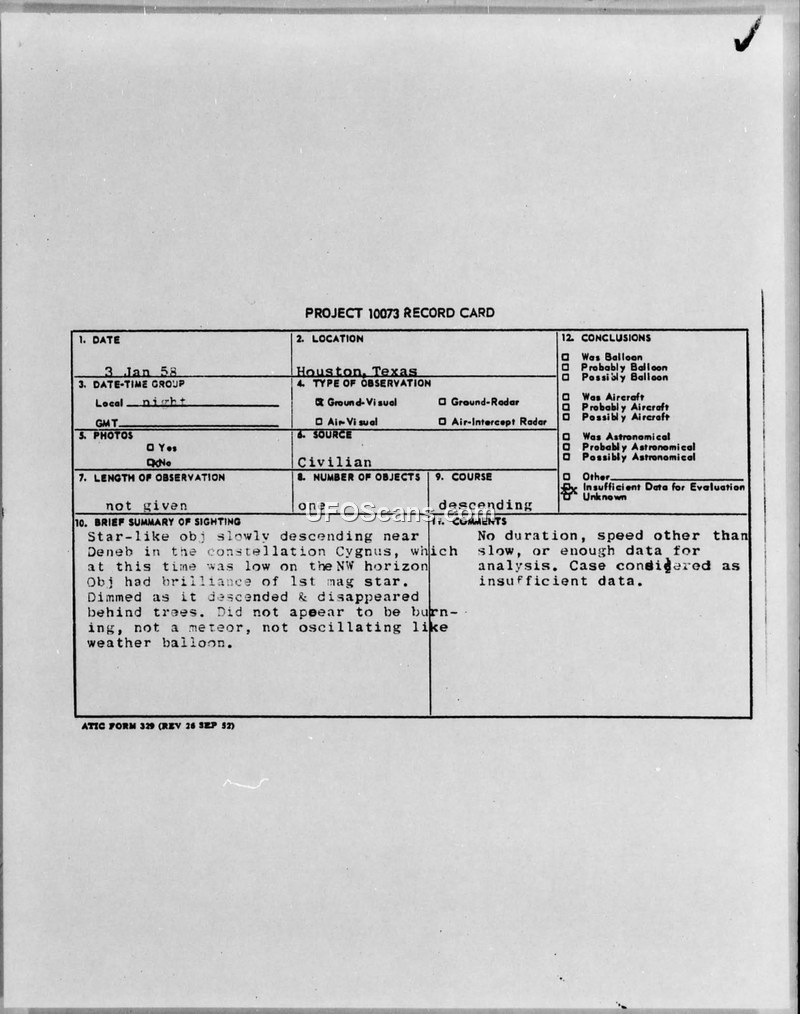 This document collection contains Project 10073 record cards and official Air Force correspondence regarding three separate UFO sightings reported by a civilian in Houston, Texas, in January 1958. The witness, who wrote to TIME magazine, described three distinct events. On January 3, 1958, the witness observed a star-like object descending near the constellation Cygnus. On January 12, 1958, the witness reported seeing a brilliant, orange-colored object that appeared to be burning, which they observed through binoculars. On January 14, 1958, the witness reported seeing four oval-shaped objects flying in formation at low altitude, which they estimated to be under 150 feet. The witness speculated that these objects might be related to operations at Ellington Field. The Air Force response, authored by Major Lawrence J. Tacker and Nicholas Post, dismissed the reports as unreliable. The Air Force stated they had no record of a burning object on January 12 and suggested the January 14 objects were likely high-flying jet aircraft. The January 3 sighting was later categorized by the Air Force as a bolide. The correspondence highlights the Air Force's frustration with civilian reporting methods, noting that the witness should have contacted local police or fire departments rather than a national magazine. The documents emphasize the difficulty of evaluating sightings without accurate data, such as photographs, precise azimuths, or bearings.