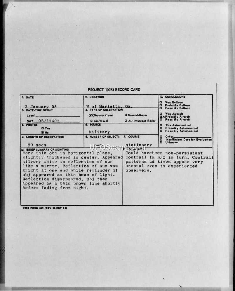 This document details a UFO sighting report filed under Project 10073, occurring on January 3, 1958, near Marietta, Georgia. The witness, identified as a highly experienced Chief Controller at Dobbins Air Force Base, observed a stationary, thin object in a horizontal plane that appeared slightly thickened in the center. The object was described as having a silvery-white, mirror-like reflection of the sun, which appeared as a bright beam at one end. As the object changed aspect, the reflection traveled along its length. The object eventually appeared as a thin brown line before fading from sight after approximately 90 seconds. The sighting occurred under clear, unlimited visibility conditions. Military radar units, specifically the 80th ACWRON, reported no unusual tracks, though they noted numerous aircraft in the vicinity. The Director of Intelligence evaluated the report and suggested that the object was likely a non-persistent contrail from an aircraft in a turn. While a research balloon launch from Vernalis, California, was investigated as a possibility, it was largely ruled out due to the short duration of the sighting and the excellent weather conditions. The report emphasizes that even experienced observers can find contrail patterns unusual.