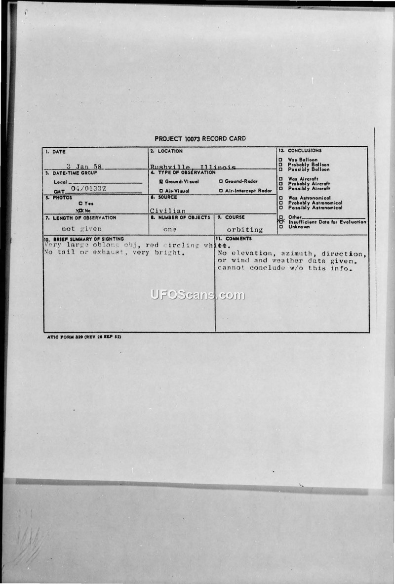 Project 10073 Record Card — Rushville, Illinois, 3 January 1958
