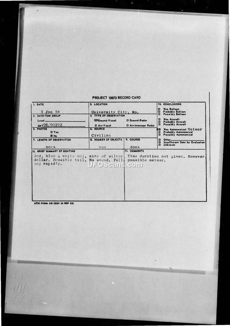 A civilian in University City, Missouri, reported a round, blue and white object falling rapidly on January 5, 1958. Military authorities investigated the report and concluded the object was likely an astronomical meteor.