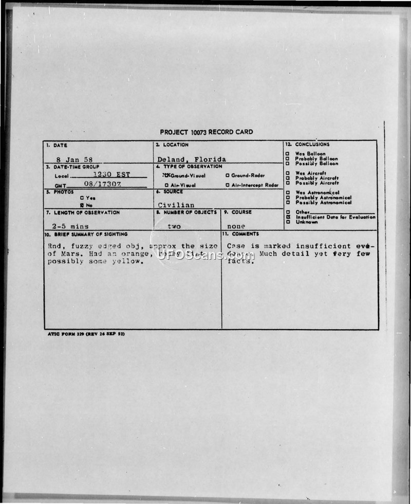 Project 10073 Record Card — Deland, Florida, 8 Jan 58