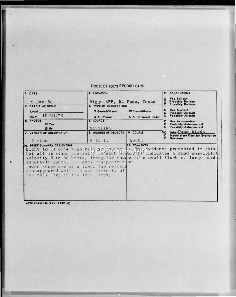 On January 9, 1958, radar at Biggs AFB tracked 8-11 unidentified objects moving at 0-50 knots. The official conclusion attributed the radar returns to a flock of large birds.