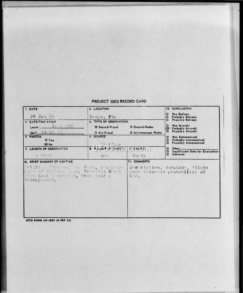 Project 10073 Record Card — Tampa, Florida, 10 January 1958