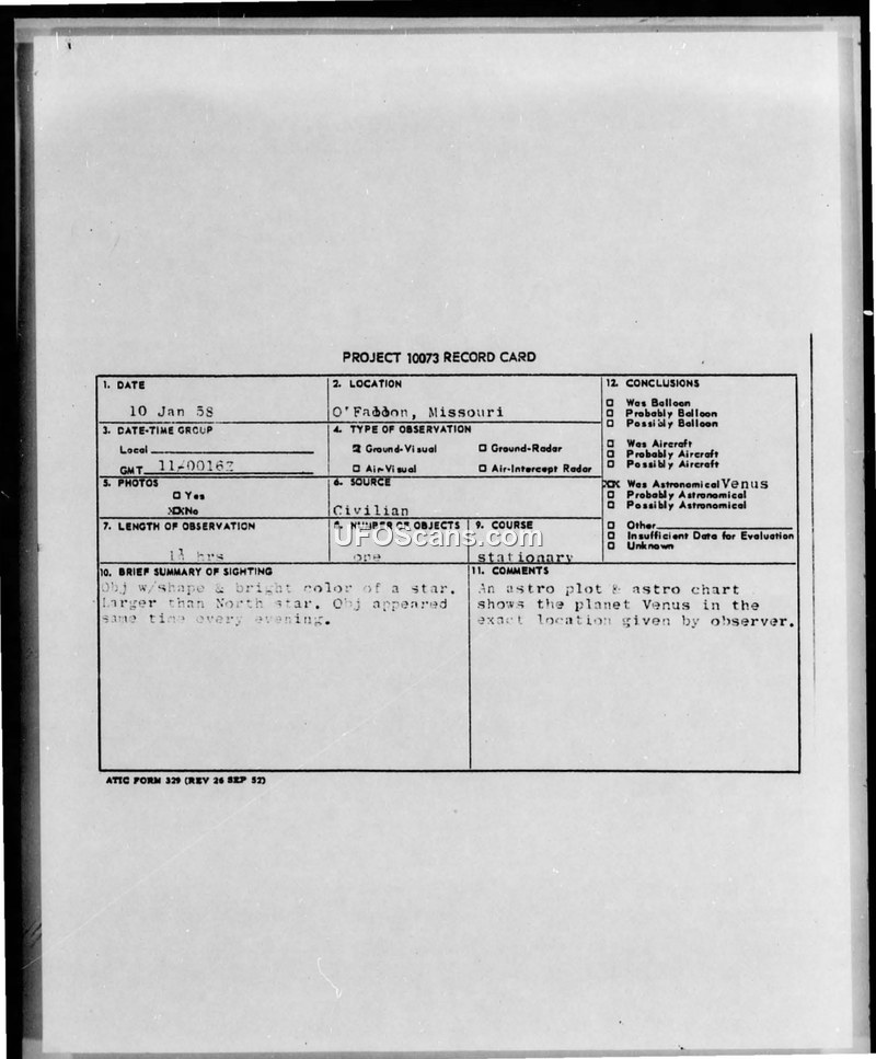 Project 10073 Record Card — O'Fallon, Missouri, 10 January 1958